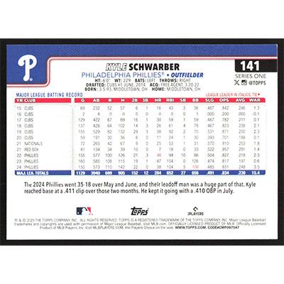 This is a 2025 Topps Kyle Schwarber baseball card. The card is #141 and pictures show condition.