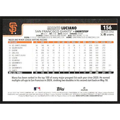 This is a 2025 Topps Marco Luciano baseball card. The card is #156 and pictures show condition.