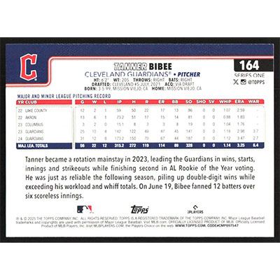 This is a 2025 Topps Tanner Bibee baseball card. The card is #164 and pictures show condition.
