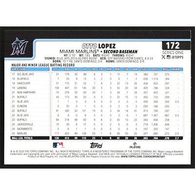This is a 2025 Topps Otto Lopez baseball card. The card is #172 and pictures show condition.