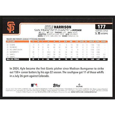This is a 2025 Topps Kyle Harrison Future Stars baseball card. The card is #177 and pictures show condition.