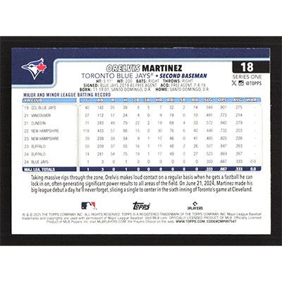 This is a 2025 Topps Orelvis Martinez baseball card. The card is #18 and pictures show condition.