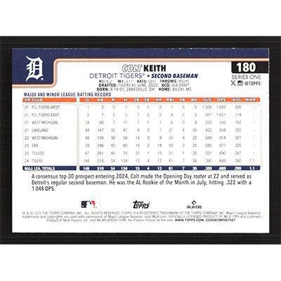 This is a 2025 Topps Colt Keith baseball card. The card is #180 and pictures show condition.