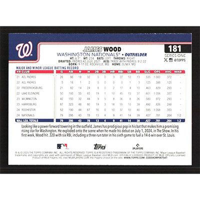 This is a 2025 Topps James Wood baseball card. The card is #181 and pictures show condition.