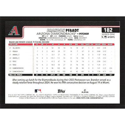 This is a 2025 Topps Brandon Pfaadt baseball card. The card is #182 and pictures show condition.