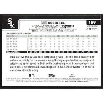 This is a 2025 Topps Luis Robert Jr. baseball card. The card is #189 and pictures show condition.