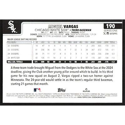 This is a 2025 Topps Miguel Vargas baseball card. The card is #190 and pictures show condition.
