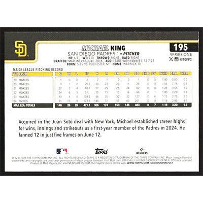 This is a 2025 Topps Michael King baseball card. The card is #195 and pictures show condition.