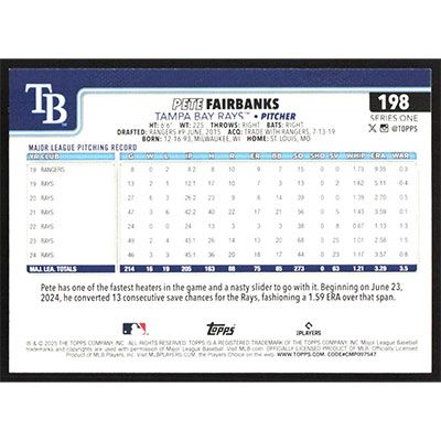 This is a 2025 Topps Pete Fairbanks baseball card. The card is #198 and pictures show condition.