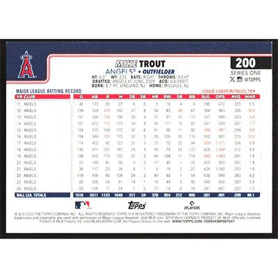 This is a 2025 Topps Mike Trout baseball card. The card is #200 and pictures show condition.