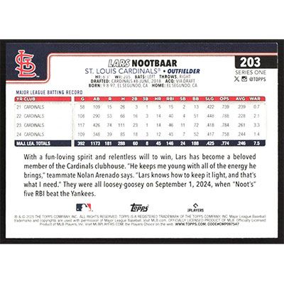 This is a 2025 Topps Lars Nootbaar baseball card. The card is #203 and pictures show condition.