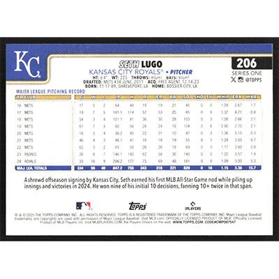 This is a 2025 Topps Seth Lugo baseball card. The card is #206 and pictures show condition.