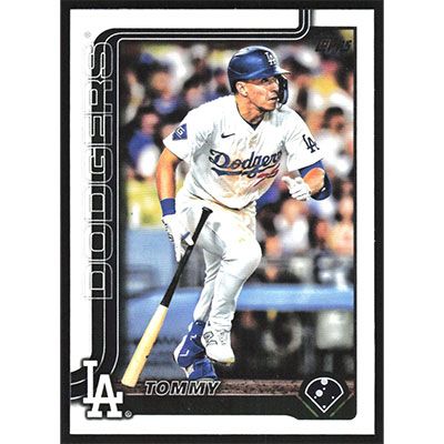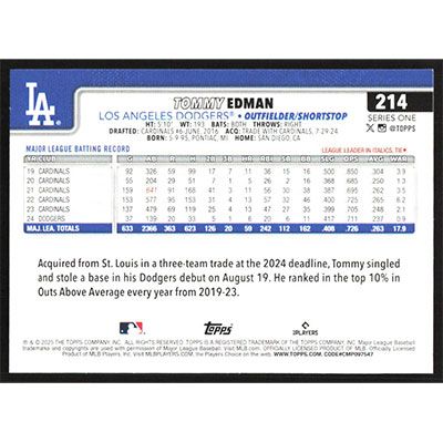 This is a 2025 Topps Tommy Edman baseball card. The card is #214 and pictures show condition.