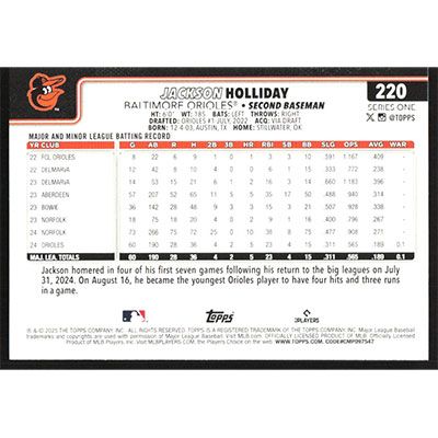 This is a 2025 Topps Jackson Holliday Future Stars baseball card. The card is #220 and pictures show condition.