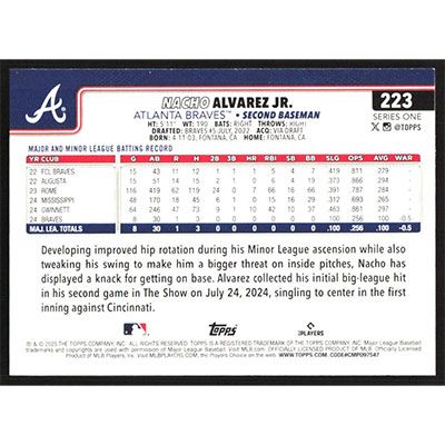 This is a 2025 Topps Nacho Alvarez Jr. baseball card. The card is #223 and pictures show condition.