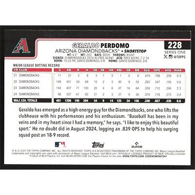 This is a 2025 Topps Geraldo Perdomo baseball card. The card is #228 and pictures show condition.