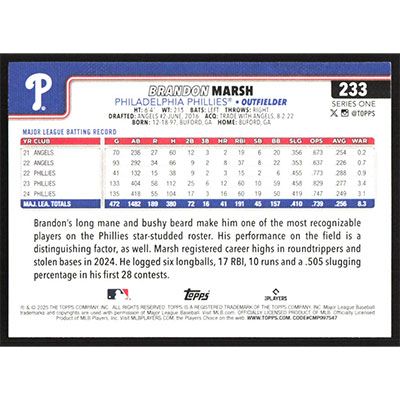 This is a 2025 Topps Brandon Marsh baseball card. The card is #233 and pictures show condition.