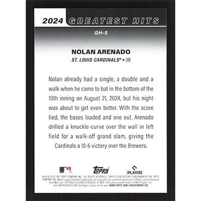This is a 2025 Topps '24 Greatest Hits Nolan Arenado baseball card. The card is #GH-5 and pictures show condition.