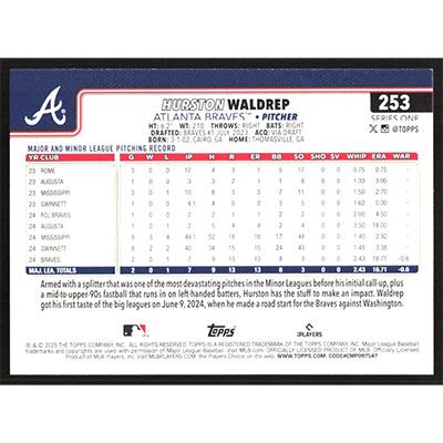 This is a 2025 Topps Hurston Waldrep baseball card. The card is #253 and pictures show condition.