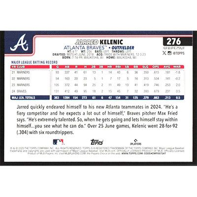 This is a 2025 Topps Jarred Kelenic baseball card. The card is #276 and pictures show condition.