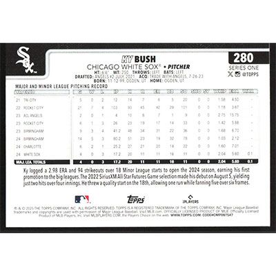 This is a 2025 Topps Ky Bush baseball card. The card is #280 and pictures show condition.
