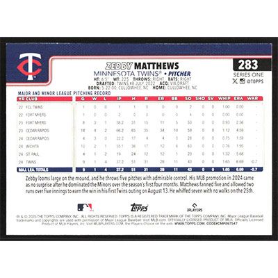 This is a 2025 Topps Zebby Matthews baseball card. The card is #283 and pictures show condition.