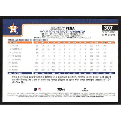 This is a 2025 Topps Jeremy Pena baseball card. The card is #307 and pictures show condition.