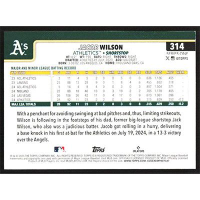 This is a 2025 Topps Jacob Wilson baseball card. The card is #314 and pictures show condition.