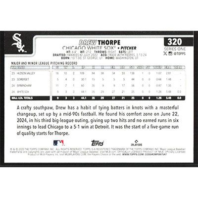 This is a 2025 Topps Drew Thorpe baseball card. The card is #320 and pictures show condition.