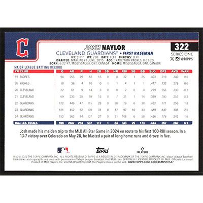 This is a 2025 Topps Josh Naylor baseball card. The card is #322 and pictures show condition.