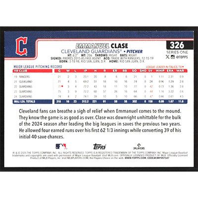 This is a 2025 Topps Emmanuel Clase baseball card. The card is #326 and pictures show condition.