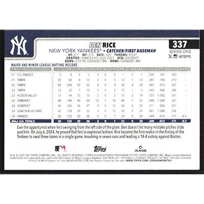 This is a 2025 Topps Ben Rice baseball card. The card is #337 and pictures show condition.