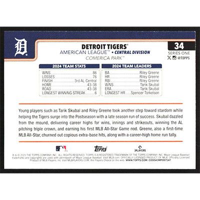 This is a 2025 Topps Detroit Tigers Team Card baseball card. The card is #34 and pictures show condition.