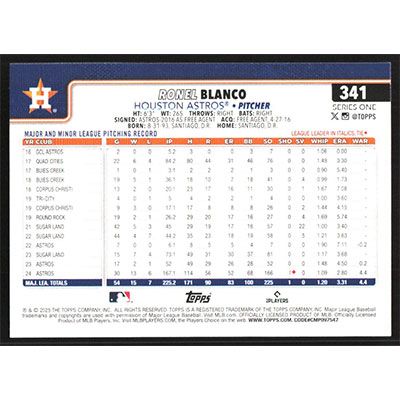 This is a 2025 Topps Ronel Blanco baseball card. The card is #341 and pictures show condition.