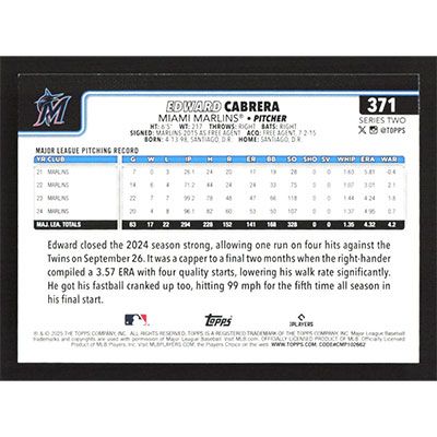 This is a 2025 Topps Edward Cabrera baseball card. The card is #371 and pictures show condition.