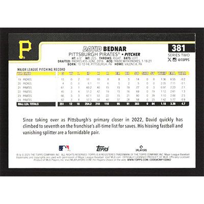 This is a 2025 Topps David Bednar baseball card. The card is #381 and pictures show condition.