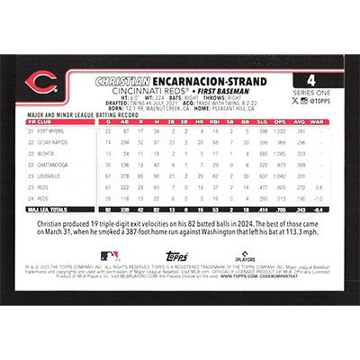 This is a 2025 Topps Christian Encarnacion-Strand baseball card. The card is #4 and pictures show condition.