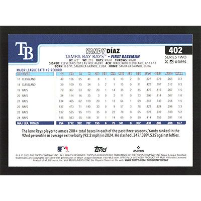 This is a 2025 Topps Yandy Diaz baseball card. The card is #402 and pictures show condition.