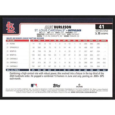 This is a 2025 Topps Alec Burleson baseball card. The card is #41 and pictures show condition.