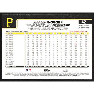 This is a 2025 Topps Andrew McCutchen baseball card. The card is #42 and pictures show condition.
