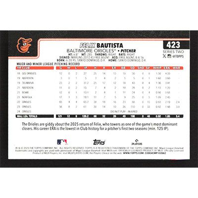 This is a 2025 Topps Felix Bautista baseball card. The card is #423 and pictures show condition.