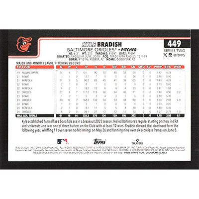 This is a 2025 Topps Kyle Bradish baseball card. The card is #449 and pictures show condition.