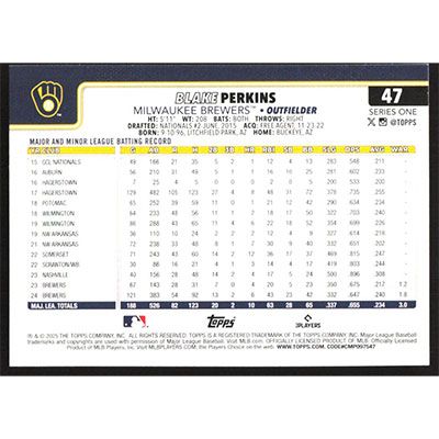 This is a 2025 Topps Blake Perkins baseball card. The card is #47 and pictures show condition.