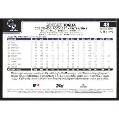 This is a 2025 Topps Michael Toglia baseball card. The card is #48 and pictures show condition.
