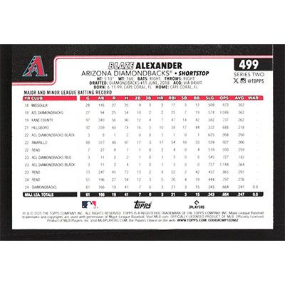 This is a 2025 Topps Blaze Alexander baseball card. The card is #499 and pictures show condition.