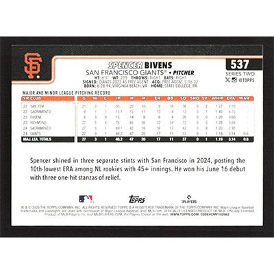 This is a 2025 Topps Spencer Bivens baseball card. The card is #537 and pictures show condition.