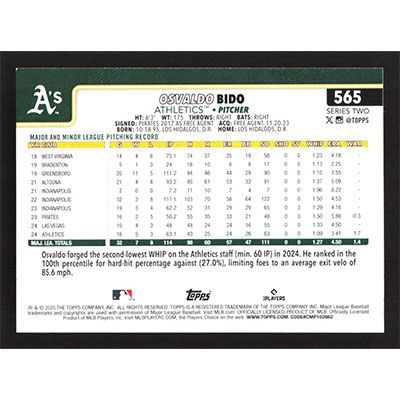 This is a 2025 Topps Osvaldo Bido baseball card. The card is #565 and pictures show condition.