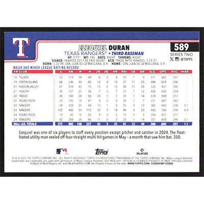 This is a 2025 Topps Ezequiel Duran baseball card. The card is #589 and pictures show condition.