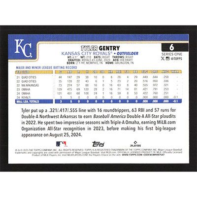 This is a 2025 Topps Tyler Gentry baseball card. The card is #6 and pictures show condition.