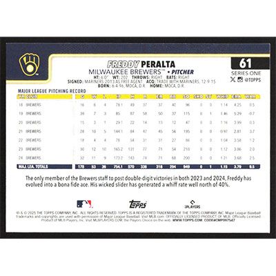 This is a 2025 Topps Freddy Peralta baseball card. The card is #61 and pictures show condition.